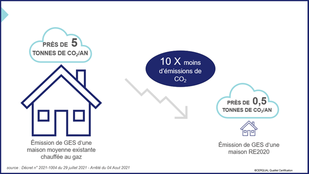 Avec toutes ces actions les émissions de gaz à effet de serre d'une maison RE2020 peuvent etre jusqu'à 10 fois moins important que celles d'une maison moyenne existante et chauffée au gaz selon NF habitat